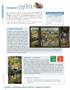 Concienci Otro paso más en el camino nos lleva a la obra de Jheronimus Van Aken, (1450-1516), originario de los Países Bajos y más conocido como el Bosco. Su obra más famosa, el jardín de las delicias, está expuesta en el Museo del Prado. Inicialmente lucía en el palacio de los Nassau en Bruselas, pero el Rey Felipe II se encaprichó de este tríptico, lo compró y lo trajo al monasterio de El Escorial en 1593. Es una obra muy compleja así que solo vamos a explicarte un par de detalles estrechamente relacionados con nuestra tema. EL PARAÍSO AMENAZADO Vocabulario/VOCABULARY Iconografía/ICONOGRAPHY: Conjunto de imágenes, retra- tos o representaciones plásti- cas, especialmente de un mis- mo tema o con características similares. El tríptico, un óleo sobre tabla de roble, de 220 x 389 centímetros, representa el episodio del Génesis. En las puertas exteriores el Bosco pintó en grisalla, una pintura realizada con diferentes tonos de gris, blanco y negro que imita relie- ves escultóricos o recrea espacios arqui- tectónicos, el tercer día de la creación del mundo. Aparece también una gran roca antropomorfa, en la que adverti- mos el perfil del demonio. Sobre la roca, una palmera, que simboliza el árbol de la ciencia, del bien y del mal, pero la serpiente tentadora baja por su tronco y por la roca reptan alimañas. El Bosco nos advierte con todo ello de que, pese a estar en el Paraíso, el pecado ya está acechando. Es una premonición de lo que se avecina. ADÁN, EVA... Y LA LECHUZA El Bosco inmortaliza el momento en el que Dios presenta a la pareja y bendice la unión: coge la mano de Eva, mientras los pies estirados de Adán rozan el manto del creador. Adán, que acaba de despertarse, mira embelesa- do a la seductora Eva, arrodillada y que baja la mirada. Pero, justo encima de la escena, asomada en un hueco de la fuente de los cuatro ríos, vemos una lechuza, animal relacionado con la maldad y el pecado, pero también con la sabiduría. Junto a Adán, el Bosco pinta animales (un elefante, aves) que repre- sentan la fuerza, la inteligencia... Junto a Eva, una jirafa, un cisne, un conejo..., símbolos de pureza y fecundidad. Comprendo e interpreto 7. Basándote en el relato del Génesis, (ver anexo 1 del tema) dibuja o describe tu visión de la Creación, de Adán y Eva. Explica los símbolos que utilices. 16 arte © EDITORIALVICENSVIVES DESARROLLAMOS
