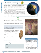1. Un recorrido por los orígenes Aquí estás, a punto de comenzar un nuevo camino que te invita a adentrarte en el principio, en el origen, en ese primer momento en el que el ser humano, al VER LO QUE LE RODEA, PIENSA Y SE PRE- GUNTA: ¿Qué es toda esta maravilla?, ¿quién es su autor?, ¿cuál es su ori- gen?, ¿cómo describir tanta BELLEZA? Para dar respuesta a estas y otras muchas preguntas sobre el uni- verso, la vida, la muerte y los fenómenos de la naturaleza, surgen los primeros mitos, a los que llamamos cosmogonías. Son la manera de dar respuesta al deseo de las personas de encontrar, desde siempre, un algo o alguien que conteste a sus interrogantes. A este principio creador, las religiones lo llaman dios. 1.1. Los primeros pasos: la prehistoria Seguro que ya sabes que para los primeros seres humanos las fuerzas de la naturaleza son muy importantes (el sol, la lluvia, el viento...) y, por eso, las temen y las adoran. Las primeras personas buscan una explicación para los misterios del ciclo de la vida. Recurren a la protección y al favor de la divinidad para tenerla cerca durante toda su vida. Para relacionarse con este ser supe- rior y obtener su protección y beneficio, se sirven de ceremo- nias y rituales en lugares sagrados. Les preocupa mucho la fertilidad y la represen- tan con las Venus, que son figuras femeninas de piedra o de madera, con las formas de la ma- ternidad, vientre, pecho y caderas, muy pro- nunciadas. También simbolizan la fertilidad de la tierra. Lo mismo que hacen con la supervivencia, a través de pinturas de animales y escenas de caza. Investigo y comprendo 1. Investiga y escribe en tu cuaderno qué es un tótem, un dolmen y un chamán. Pista no Nombre que recibe el ser superior creador de todo lo que existe. Cuatro letras. Nombre propio. Primer jeroglífico (final del tema). Pinturas rupestres de la cueva de Altamira. Vocabulario/VOCABULARY Mito/MYTH: Narración fantástica por medio de la cual se intenta dar explicación del origen de las cosas. Los mitos pretenden transmitir verdades. Rito/RITE: Conjunto de normas y costumbres establecidas para el culto religioso. Por medio de los ritos, las personas muestran respeto, veneración y el favor de la divinidad. 8 A D U A T O L S I ' © EDITORIALVICENSVIVES DESARROLLAMOS