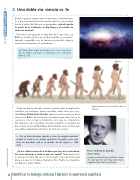 3. Una doble vía: ciencia vs. fe El título quizá te sugiera una controversia o enfrentamien- to y para muchas personas puede que lo sea, porque frente al relato del Génesis se preguntan: ¿dónde queda la teoría de la evolución, el Big Bang y el estudio de todas las ciencias? Pues bien, la respuesta es más fácil de lo que crees. La Biblia es un libro de fe y no un libro científico y es perfec- tamente compatible con las diversas teorías del origen y evolución del mundo y el ser humano. «El Señor Dios tomó al hombre y lo colocó en el jar- dín de Edén, para que lo guardara y lo cultivara» (Gén 2, 15). Todas las diferencias que creemos existen entre la explicación científica y la teológica, fueron resueltas, entre otros, por el je- suita Pierre Teilhard de Chardin, quien acercó los avances de la ciencia a la Biblia. Su teoría vino a reafirmar que entre la fe y la ciencia no solo no hay contradicción, sino que se complemen- tan. Gracias a otro sacerdote, George Lemaître, se sentaron las bases de la teoría del Big Bang, demostrando una vez más, que es posible el desarrollo armónico de la fe y la ciencia. «...No se trata de saber cuándo y cómo ha surgido material- mente el cosmos, ni cuándo apareció el hombre, sino más bien de descubrir cuál es el sentido de tal origen...». (284 CIC). ¿Te has dado cuenta de la belleza que hay en la naturaleza, los seres humanos y todo lo que nos rodea? Tanta perfección no puede ser fruto del caos o de la suerte: nace de una fuerza única a la que los cristianos llamamos Dios Padre, los musulma- nes Alá y los judíos Yahvé. Representación de la evolución del ser humano. Galaxia. Pierre Teilhard de Chardin (1881-1955) Jesuita, paleontólogo y filósofo fran- cés que aportó una muy personal y original visión de la evolución. 14 © EDITORIALVICENSVIVES DESARROLLAMOS