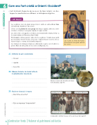6 Exterior i interior de la basílica de Santa Sofia (Istanbul, segle VI). Com era l'art cristià a Orient i Occident? • L'art dominant d'aquesta època va ser de tipus religiós i en des- taquen les manifestacions a Bizanci i a la Hispània visigòtica. L'ART BIZANTÍ Les esglésies eren de grans proporcions i amb un extraordinari luxe de materials (marbres) i decoració. Solien ser de planta de creu grega (de braços iguals), amb arcs semi- circulars, columnes i una gran cúpula a l'espai central. Les obres més conegudes es troben a Constantinoble (Santa Sofia) i a la ciutat italiana de Ravenna (Sant Vidal). Els mosaics cobrien parets i absis de les esglésies. S'elaboraven amb peces petites (tessel·les) de colors vius i representaven escenes de ca- ràcter religiós o retrats de la família imperial. Les icones són imatges religioses elaborades segons uns models re- petits: Mare de Déu amb el nen, Crist en Majestat, etc. Les icones es feien de fusta i presentaven una gran varietat de colors. 27. Defineix en què consisteixen: • mosaic: ................................................................. • cúpula: ................................................................. • tessel·la: ............................................................... 28. Observa l'exterior de Santa Sofia de Constantinoble i descriu-la: ................................................................................... ................................................................................... ................................................................................... 29. Fixa't en el mosaic i respon: – Qui hi ha al centre? ................................................................................ – Qui acompanya l'emperador? ................................................................................ ................................................................................ ................................................................................ cúpula Justinià generals de l'exèrcit L'emperador Justinià i la seva cort en un mosaic del segle VI. guàrdia personal arquebisbe Maximià 16 Contrastar fonts | Valorar el patrimoni col·lectiu dignataris eclesiàstics © EDITORIALVICENSVIVES DESENVOLUPEM